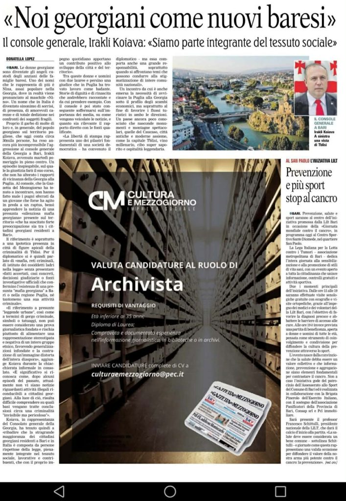 „La gazzetta del mezzogiorno“-ს, 4 თებერვლის ნომერში გამოქვეყნდა პუბლიკაცია პულიაში მცხოვრები ქართული დიასპორის შესახებ, რომელიც დაიბეჭდა ამავე გაზეთში ცოტახნით ადრე გამოქვეყნებული სტატიის საპასუხოდ. მიმდინარე წლის დასაწყისში გაზეთში „La gazzetta del mezzogiorno“ გამოქვეყნდა სტატია სათაურით – „მდუმარე ქართული მაფია“, რომელმაც სერიოზული შეშფოთება და გულისტკივილი გამოიწვია იტალიის ქალაქ ბარიში მცხოვრებ ქართულ დიასპორაში. სტატია შეეხებოდა ქალაქ ბარიში ე.წ. ქართული მაფიის არსებობას, რის შესახებაც მოთხრობილი იყო ქალაქში გავრცელებულ ხმებზე, „ურბანულ ლეგენდებზე“ დაყრდნობით, ქართული კრიმინალური სლენგის მოშველიებით, მკითხველზე უარყოფითი შთაბეჭდილების მოხდენის მიზნით. ყოველგვარი ფაქტების გარეშე საუბარი იყო ქართველების მხრიდან „უხილავ, მაგრამ საშიშ დანაშაულზე“. იმ განწყობის გათვალისწინებით, რაც სტატიამ გამოიწვია ქართულ დიასპორაში, საქართველოს გენერალურმა საკონსულომ ითანამშრომლა გაზეთთან „La gazzetta del mezzogiorno“ ახალი, საქართველოსა და ბარის ქართული დიასპორის მიმართ პოზიტიური შინაარსის პუბლიკაციის გამოქვეყნების მიზნით. გაზეთისათვის მიწოდებულ იქნა გენერალური კონსულის, ირაკლი ქოიავას კომენტარი, სადაც ხაზი გაესვა პულიაში მცხოვრები ქართული დიასპორის როლს და ინტეგრირებულობას რეგიონში. აღინიშნა, რომ დაუშვებელია, საგაზეთო პუბლიკაცია უსაფუძვლოდ ნეგატიურ იმიჯს უქმნიდეს მთელ ეთნიკურ ჯგუფს ქართულ დიასპორას. ახალი პუბლიკაცია გამოქვეყნებულია „La gazzetta del mezzogiorno“-ს 4 თებერვლის ნომერში.